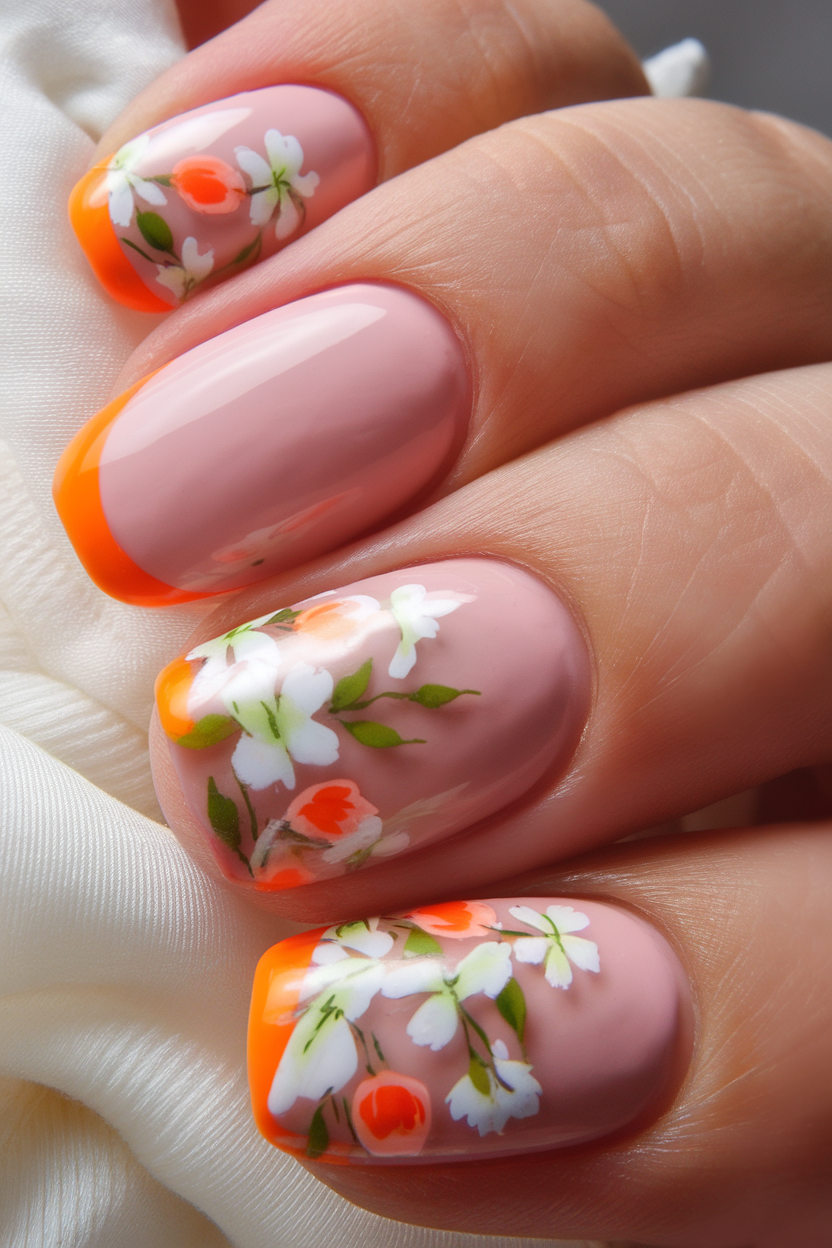 This 2025 short almond nail design combines a soft pink base with a bold orange French tip for a modern and colorful look. The intricate hand-painted white and green floral details add a romantic and delicate touch. The glossy gel finish enhances the vibrancy of the colors, making the design stand out while keeping it elegant. This manicure is a perfect mix of simple and stylish, ideal for those looking for a fresh twist on April nails ideas 2025.