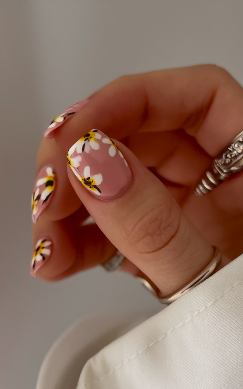 These 2025 short square nails feature a muted pink base decorated with hand-painted white daisies with yellow centers. The floral design is scattered across the nails, creating a fresh spring-inspired look. The gel polish finish ensures a smooth and glossy appearance, enhancing the vibrancy of the design. This manicure is perfect for those who love a simple yet elegant floral touch for April nails ideas 2025.