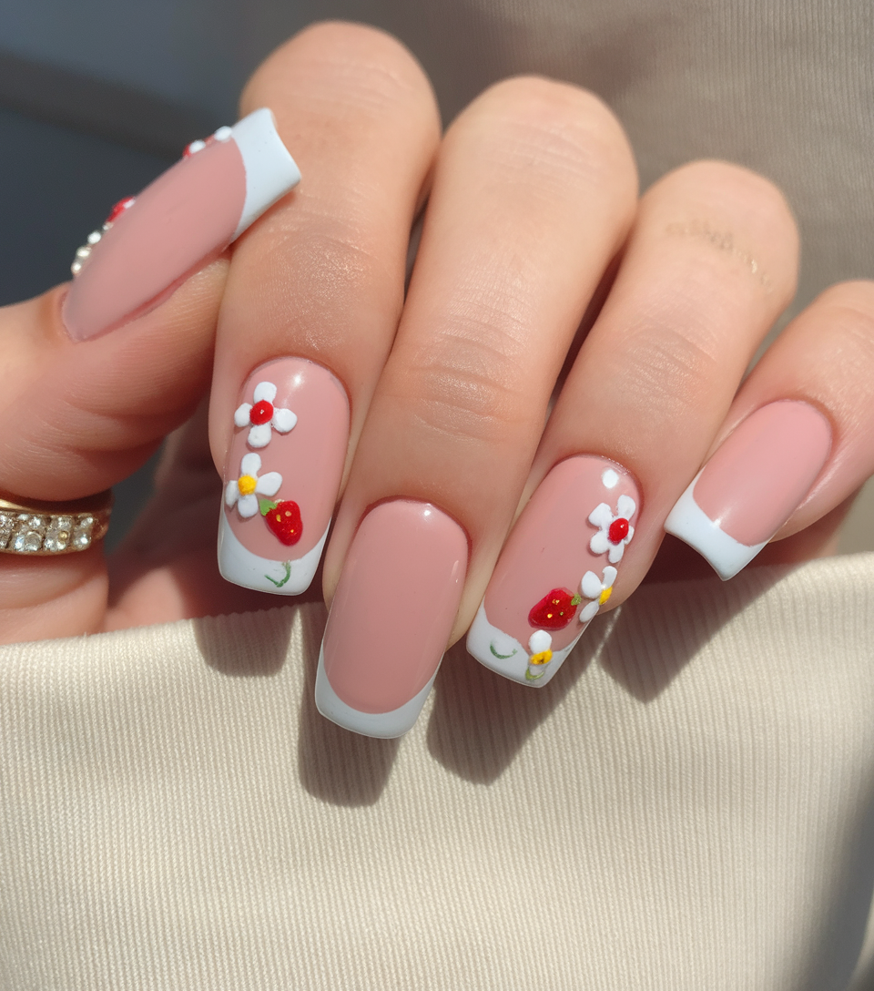 These 2025 coffin nails feature a soft pink base with a white French tip, elevated with 3D red and yellow floral accents. Tiny hand-painted strawberries add a playful yet sophisticated element, making this a perfect spring-inspired manicure. The gel finish enhances the intricate details while ensuring long-lasting shine. This look is ideal for those who love a unique yet simple take on April nails ideas 2025.
