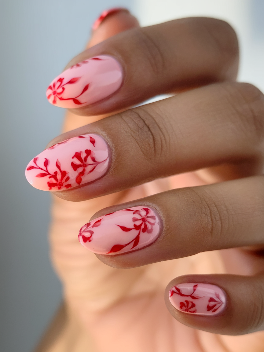 This 2025 almond nail design features a soft pink base with intricate hand-painted red floral accents. The delicate and minimalistic floral patterns add a sophisticated touch without overpowering the design. The gel polish ensures a glossy and smooth finish, making this manicure effortlessly stylish. This is a great choice for those who love a refined and modern approach to April nails ideas 2025.