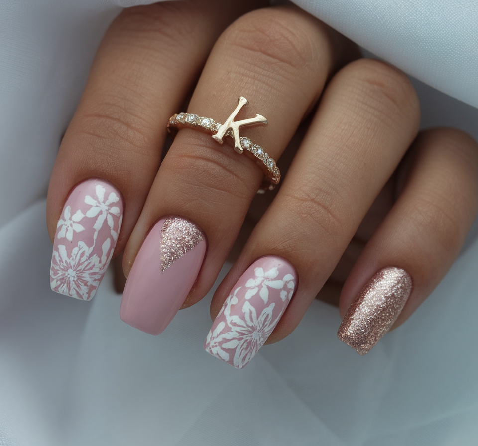 This 2025 short square design combines simple pink elegance with delicate white floral patterns. The acrylic nails feature soft pastel shades, hand-painted flowers, and a touch of rose gold glitter for a sophisticated contrast. The combination of matte and sparkling textures adds depth, making this look perfect for those who love a refined yet eye-catching manicure. It’s a flawless choice for April nails ideas 2025, bringing together timeless beauty and modern detailing.