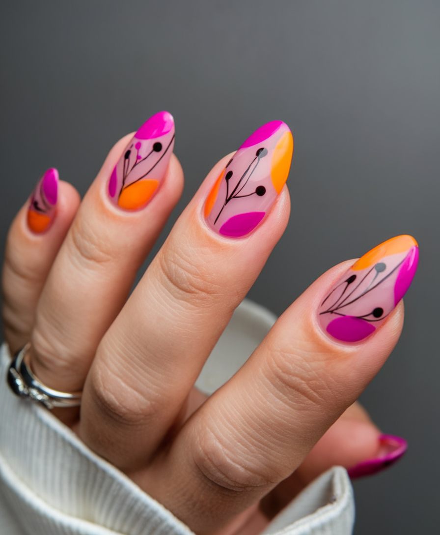 These 2025 almond nails feature a bold mix of purple, pink, and orange, creating a vibrant abstract design. The translucent base allows the colors to stand out, while the delicate black line art adds a modern, artistic flair. The gel polish ensures a glossy and long-lasting effect, making this manicure a great choice for those who love a trendy, statement look. This design is perfect for spring and adds a playful touch to April nails ideas 2025.