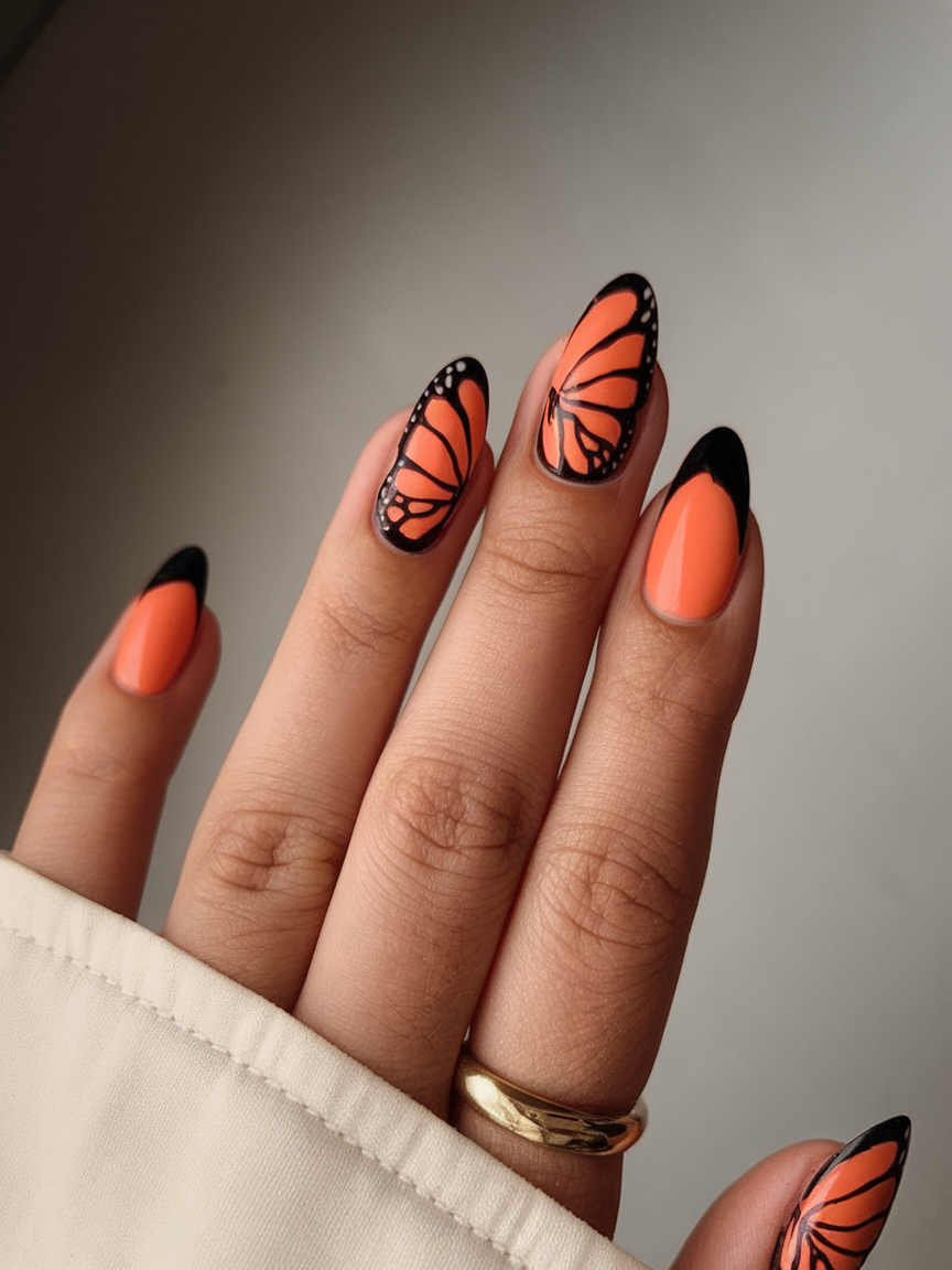 For those who love nature-inspired designs, this 2025 simple manicure captures the beauty of a butterfly’s wings. The almond shape nails feature an orange and black color combination with intricate wing detailing that mimics real monarch butterflies. The sharp black French tips complement the design, making it bold and sophisticated at the same time. This acrylic look is ideal for those who want a striking yet elegant spring-inspired manicure.