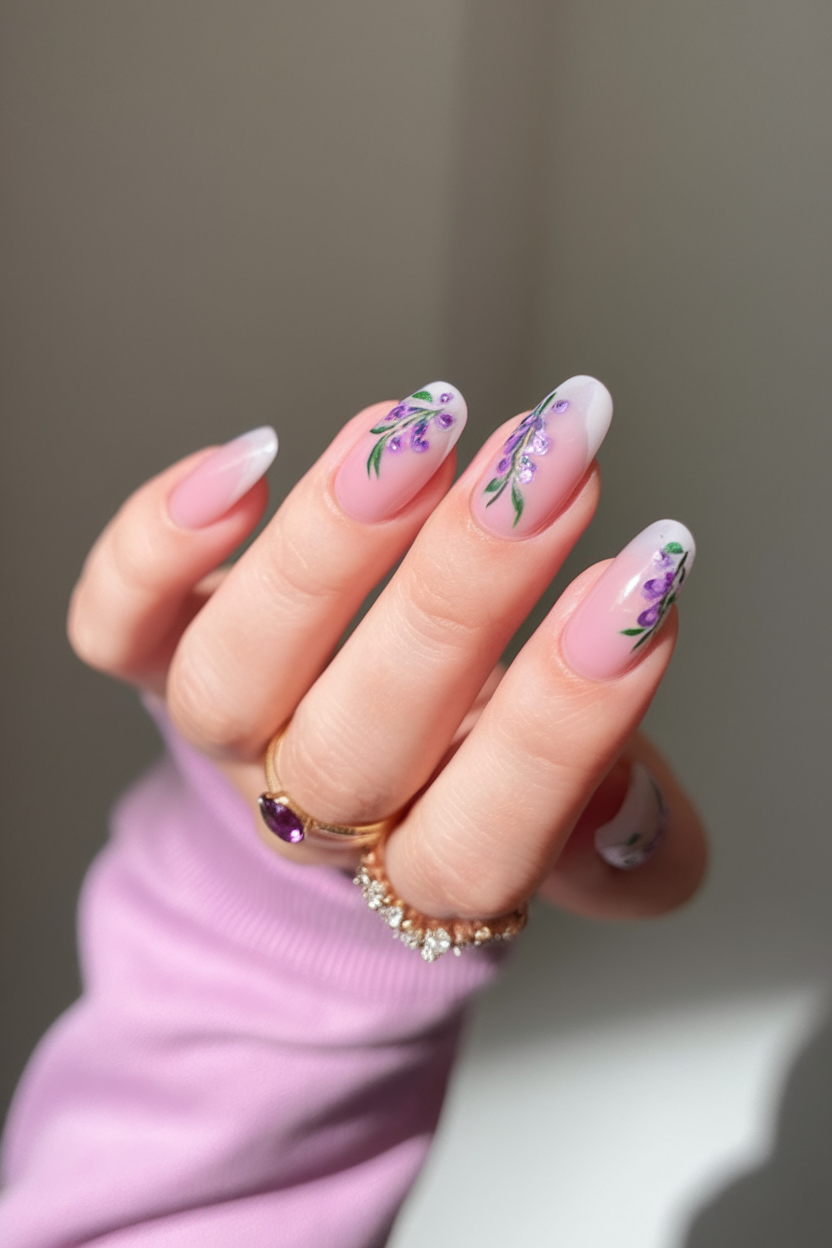 This 2025 simple manicure embraces a delicate floral theme with a sheer pink base and hand-painted purple flowers. The soft white French tips add a classic touch, complementing the intricate green leaves. The subtle gradient effect enhances the natural elegance of the almond shape nails. This look is perfect for those who want a refined and feminine Easter-ready manicure.