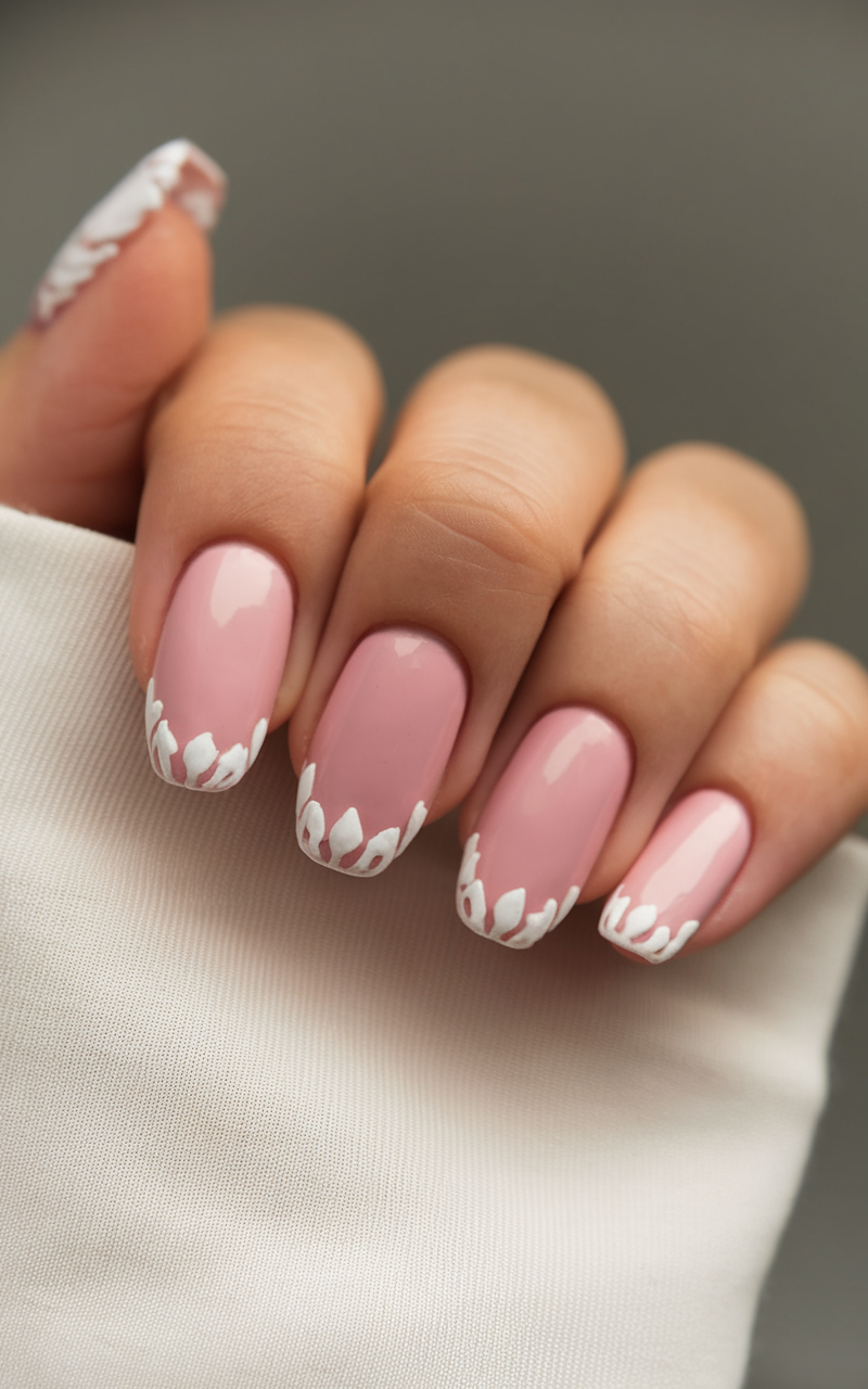 These 2025 short square nails feature a chic pink base with a minimalist floral-inspired white French tip design. The delicate petal-like strokes create a unique and modern take on the classic French manicure. The gel finish provides a smooth, glossy look that enhances the overall elegance. This style is ideal for those who love simple yet sophisticated April nails ideas 2025.