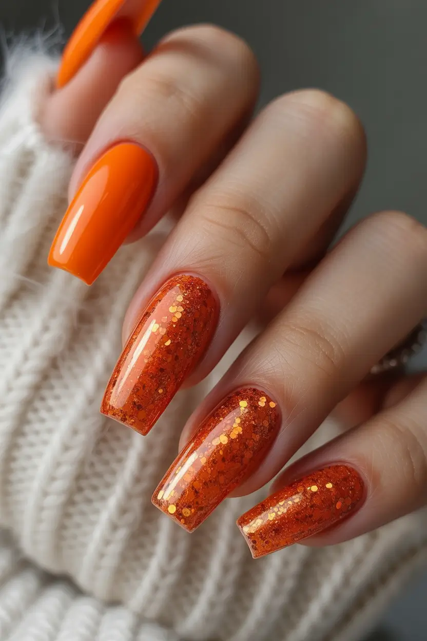 I gravitate toward this mani because it’s unapologetically cheerful. I don’t leave the house without a swipe of shimmery pumpkin across the tips—instant mood elevation. The combination of bright orange and shimmering flecks is a smile shipped straight to your fingertips, keeping the gray at bay.