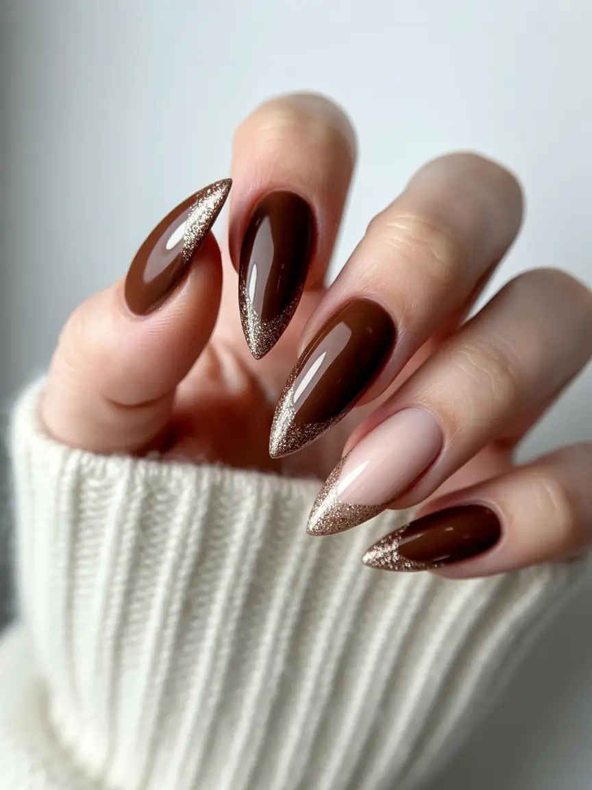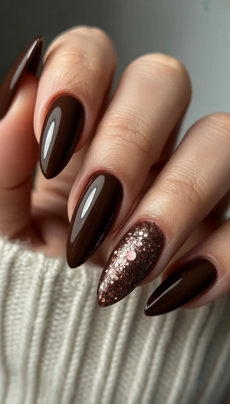 Chocolate brown is pretty much fall itself, and this version adds a bite of glitter along the almond tips to keep everything fresh without a calendar reminder. The way the sparkle fades from intense to just-kissed lets the color breathe without losing that café-hug kind of warmth—spot-on for evenings that beg for a hot drink.