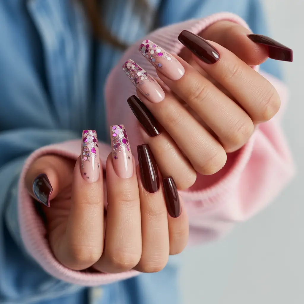 I love how quickly you can pull off this manicure—it takes practically zero time. Coat all nails in a rich chocolate base, then swipe a mixed-glitter topper, chunky and fine bits, across a single accent. Harper’s Bazaar nailed it when it said accent nails let you play without locking in a look.