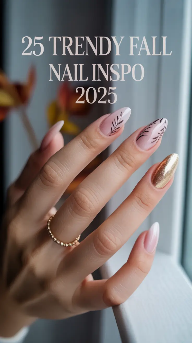 I won’t lie: when you think “fall glam,” gold and black step in and wave like they own the place. This mani pulls that combo off like a pro: two nails shine in thick molten gold, and the others wear a soft blush with lacy black leaves on top. It’s bold but knows when to whisper, and that little tug-of-war is the real showstopper.
