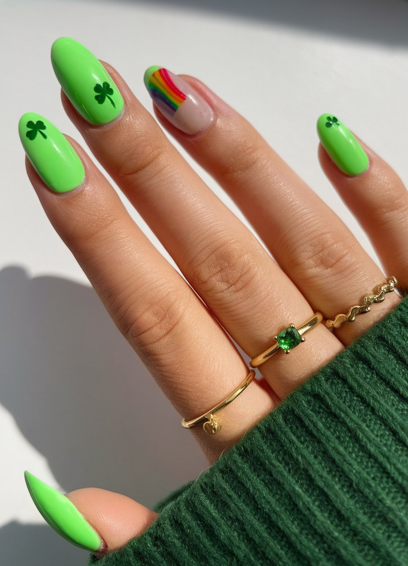 A bold spring green manicure featuring vibrant simple almond nails with a playful St. Patrick’s Day theme. The rich gel polish creates a glossy finish, while delicate four-leaf clovers add a festive touch. A single accent nail with a rainbow design brings a pop of color, making this look ideal for a fun St. Patrick’s Day easy manicure.