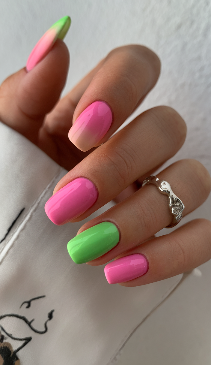 A bold and fun spring short manicure featuring spring pink and simple green shades. The short square nails alternate between solid neon tones and soft gel ombre blends for a lively yet balanced look. The acrylic simple design makes this a perfect choice for a fresh, modern 2025 manicure.