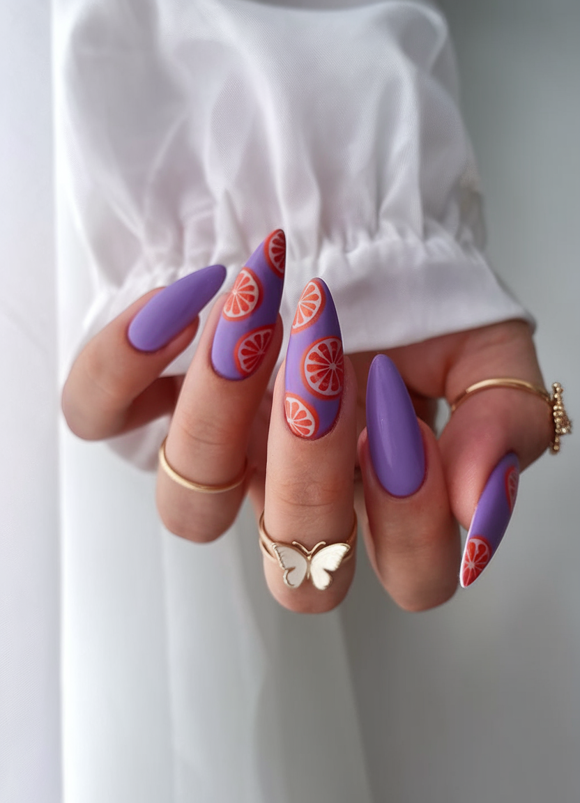 This 2025 almond design embraces a bold purple base with detailed hand-painted citrus slices for a playful, fruity touch. The gel finish enhances the vibrancy of the colors while maintaining a smooth look. The simple almond shape makes this an eye-catching yet wearable manicure perfect for the transition into spring.