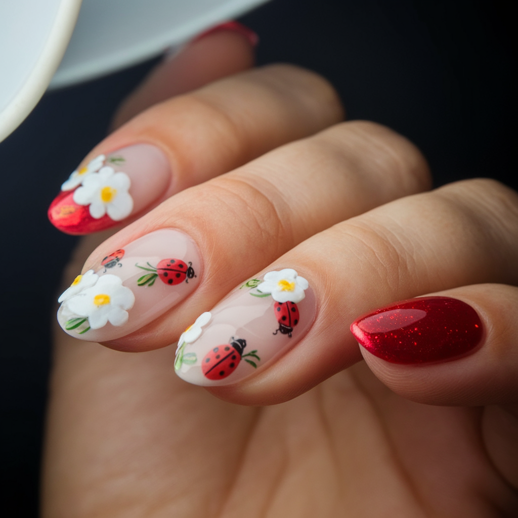 A charming and whimsical spring almond manicure featuring delicate white daisies and intricate ladybug designs. The acrylic short nails have a clear gel base that allows the floral details to stand out, while a single red glitter accent nail adds contrast. This manicure is perfect for those looking for a spring short design with a touch of nature-inspired artistry.