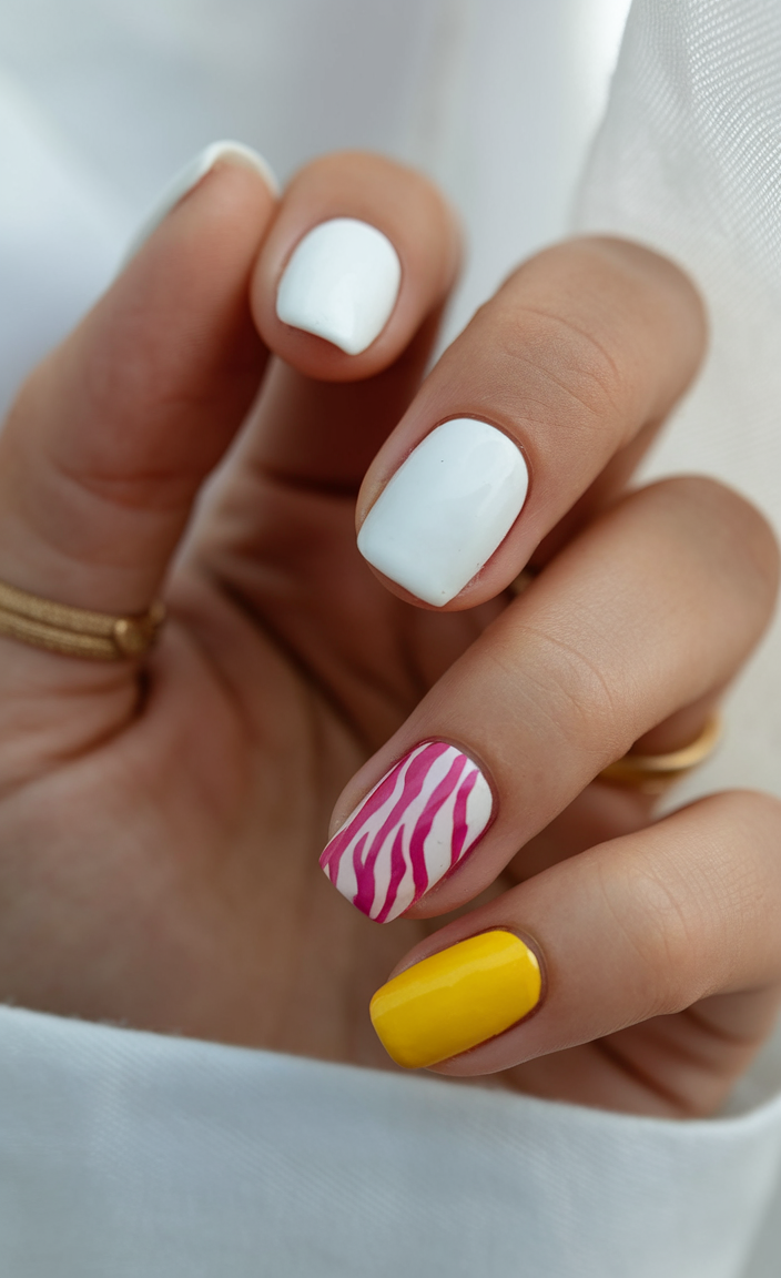 This short square manicure keeps it clean and modern with a simple short white and yellow color combination. A single accent nail features a vibrant spring pink zebra print, adding a playful touch to the acrylic simple look. The gel finish enhances the sleek and polished effect, making it a perfect balance between minimalism and bold design.
