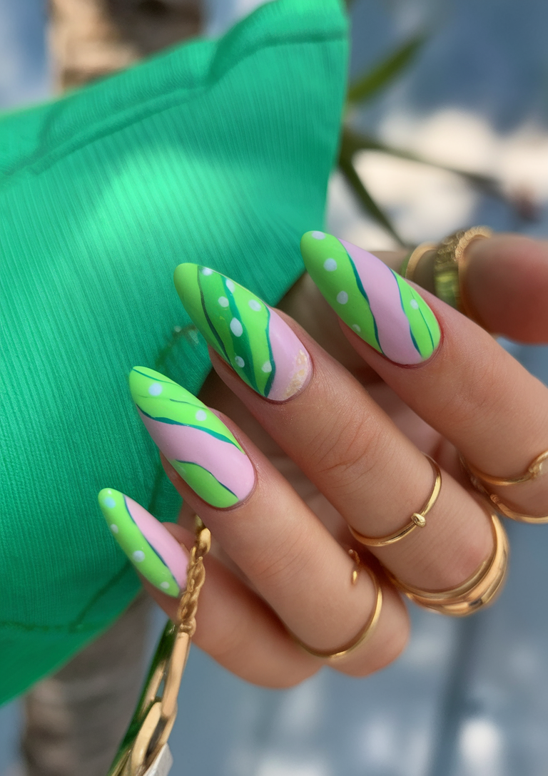 A bold spring almond manicure featuring simple green and spring pink swirls with a playful abstract design. The gel finish keeps the colors fresh and vivid, while the 2025 almond shape gives the nails an elongated, stylish look. White dotted details add dimension, making this a statement acrylic short manicure perfect for the season.