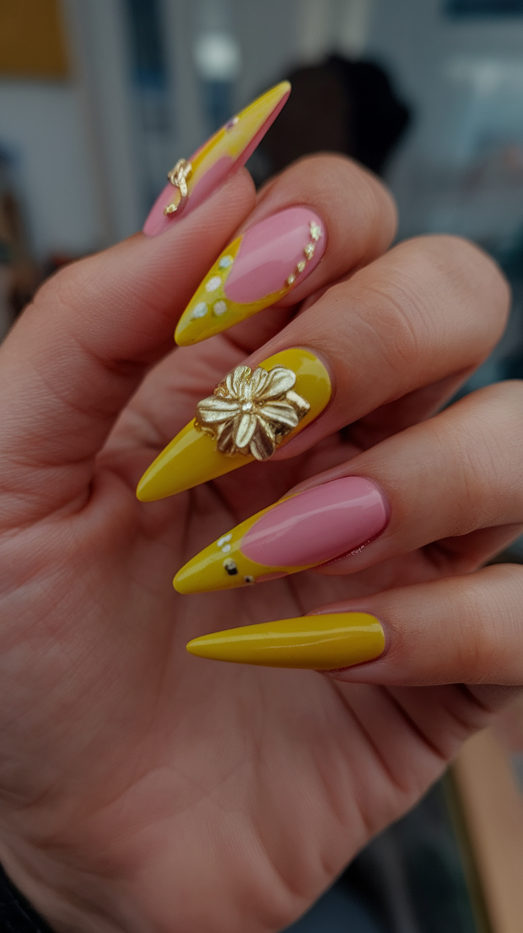A bold spring almond manicure featuring a striking mix of spring pink and simple green with a bright yellow base. The 2025 almond shape elongates the nails, while intricate gold 3D floral embellishments add a luxurious touch. The gel finish enhances the vibrant colors, making this a standout choice for those who love artistic nail designs.
