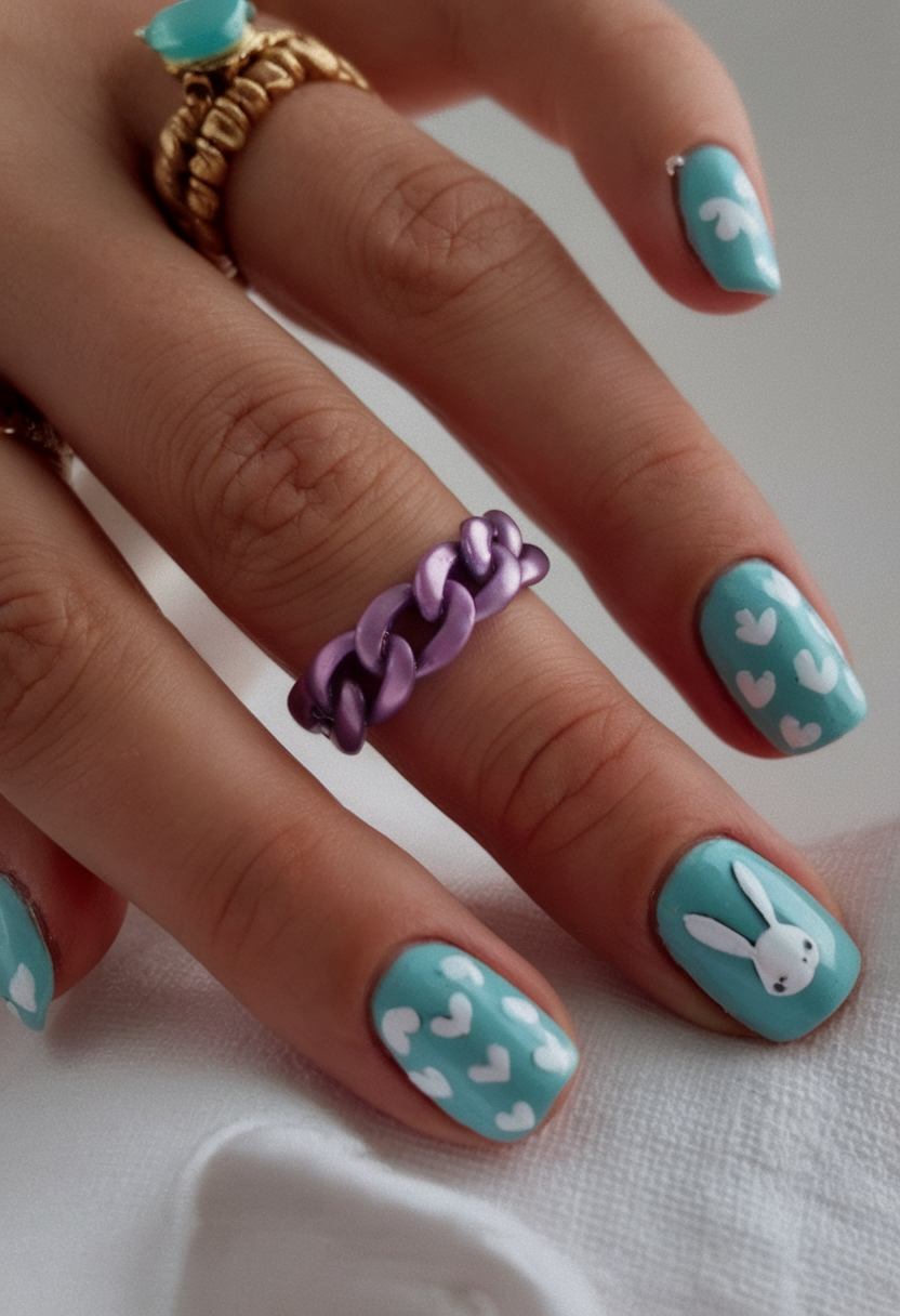 A playful spring short manicure with a soft blue base and white heart accents, perfect for an Easter theme. A cute bunny detail on the accent nail makes this simple short design both festive and charming. The short square shape and gel finish keep the look fresh and fun for the season.