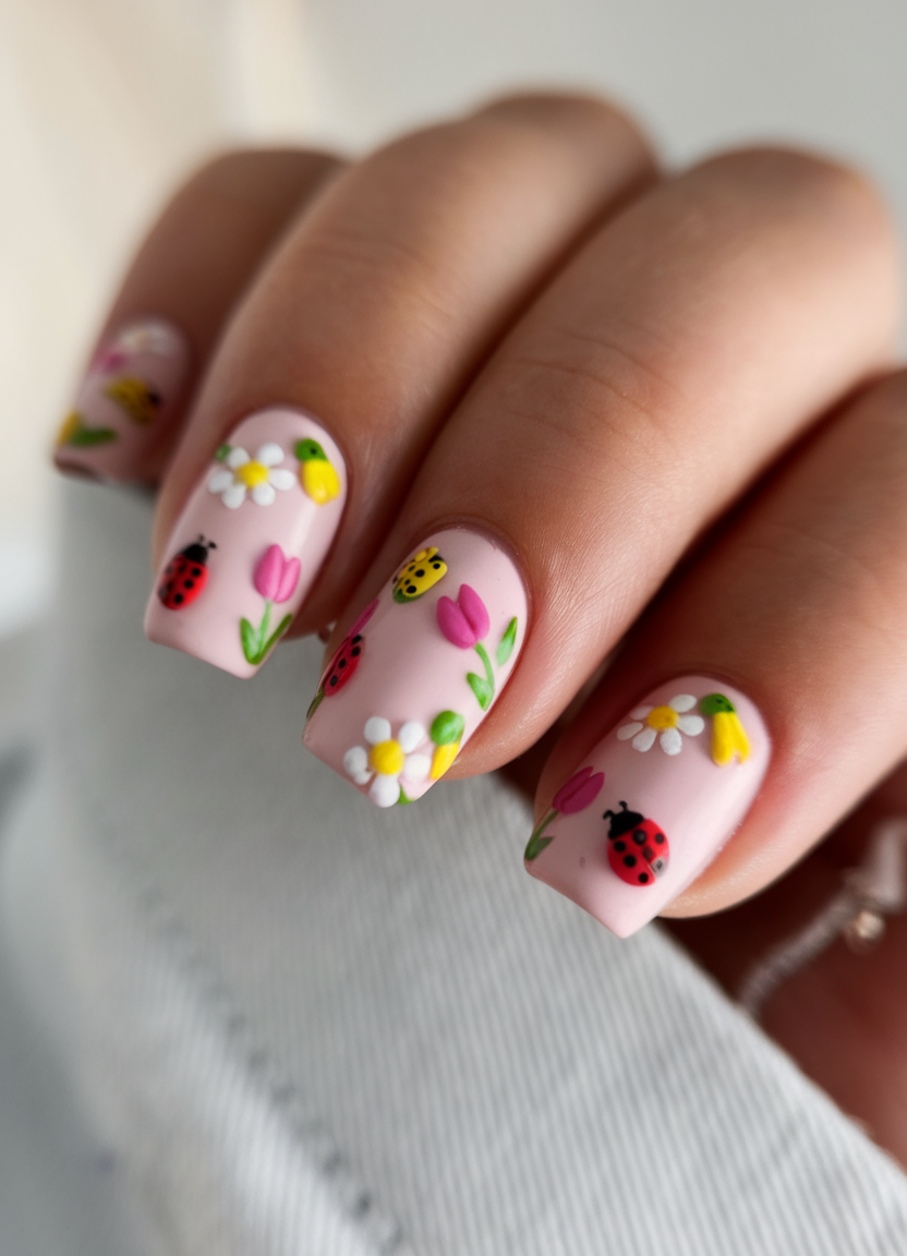 A delicate spring pink manicure with intricate hand-painted ladybugs, daisies, and tulips for a nature-inspired look. The short square nails provide a neat and polished finish, while the acrylic simple floral details add texture and dimension. This spring short design is perfect for anyone who loves colorful and cheerful nail art.
