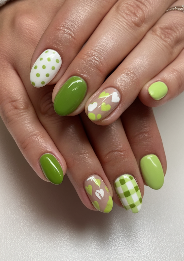 A cheerful spring short manicure featuring a mix of simple green tones, polka dots, gingham, and heart details. The short square shape keeps the design neat, while the gel finish enhances the glossy and vibrant look. This acrylic simple style is perfect for those who love a fun yet balanced manicure for 2025.