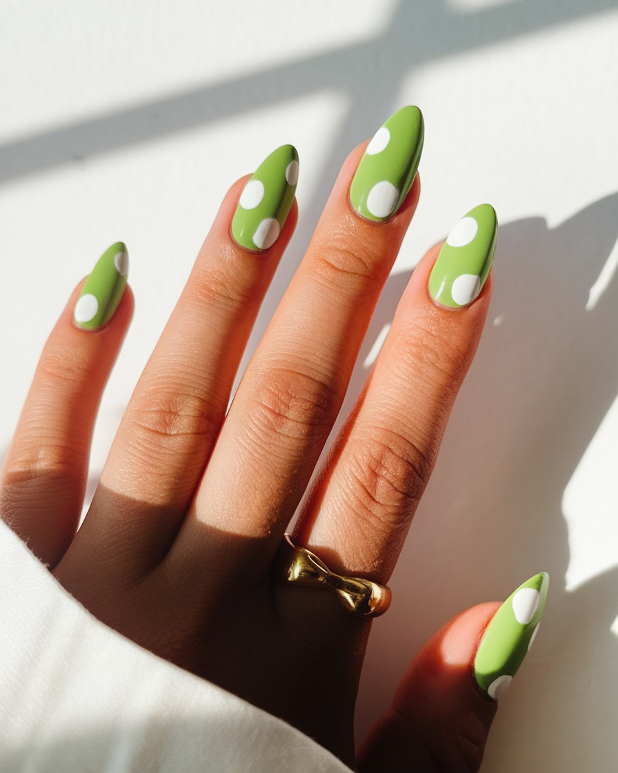 This spring almond nail design brings a fresh and playful vibe with a simple green base and classic white polka dots. The 2025 almond shape keeps the look modern, while the contrast of white and green adds a chic, retro feel. Perfect for those who love simple short yet stylish nails, this design is a fun way to welcome the warmer season.