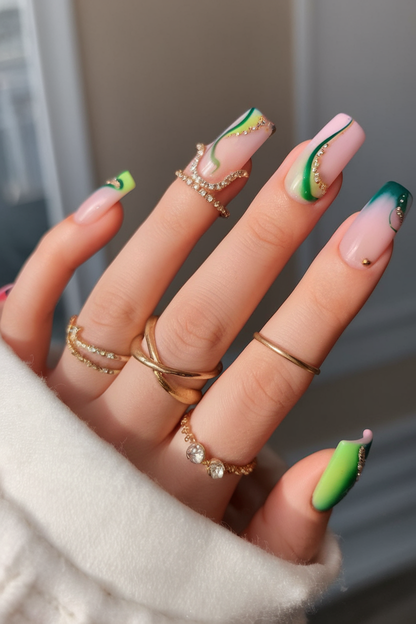 A sophisticated spring square design with a soft pink base and green gradient swirls. Gold accents and fine embellishments add a luxurious touch, while the gel finish enhances the smooth transitions of color. The 2025 almond style keeps this look modern, making it ideal for both casual and dressy occasions.