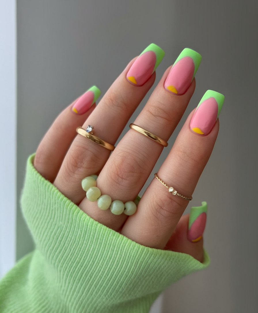 A bold take on the French tips trend with spring pink bases and neon simple green tips. A small yellow detail at the center of each tip adds a unique contrast, making this short square manicure stand out. The gel application provides a polished finish, keeping the look fresh and trendy for 2025.