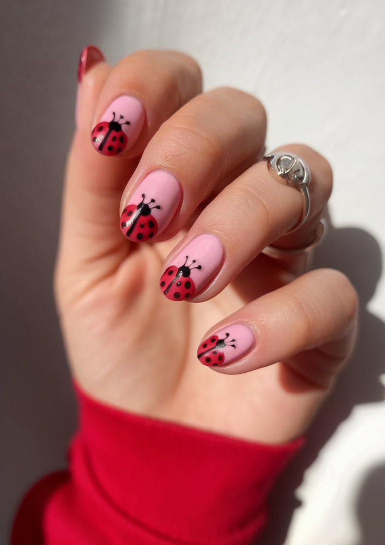 A charming spring short manicure featuring a soft spring pink base with adorable ladybug nail art. The short square shape keeps the design neat and wearable, while the gel finish enhances the vibrant red and black details. This acrylic simple style is perfect for those who love fun and nature-inspired nail designs for 2025.