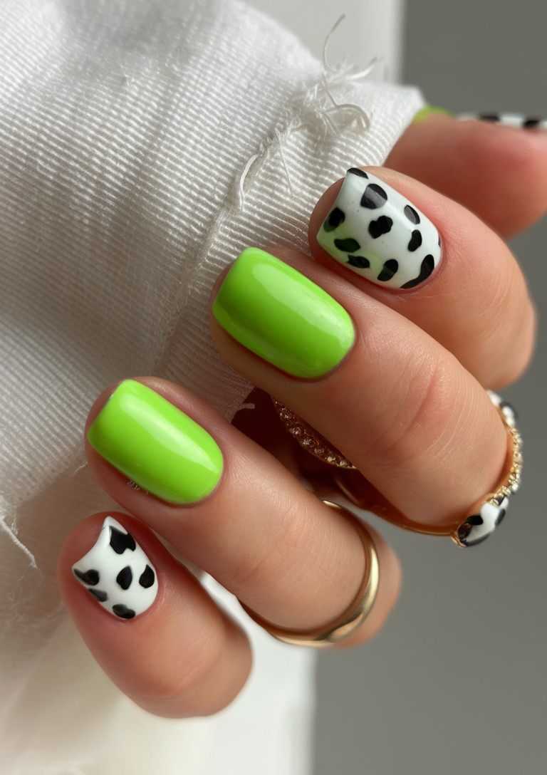 A bold simple green manicure featuring short square nails with a playful mix of neon and black-and-white cow print. The gel polish gives a glossy, eye-catching effect, while the acrylic simple design keeps the look trendy and modern. This spring short manicure is perfect for those looking for a fun, statement-making style.