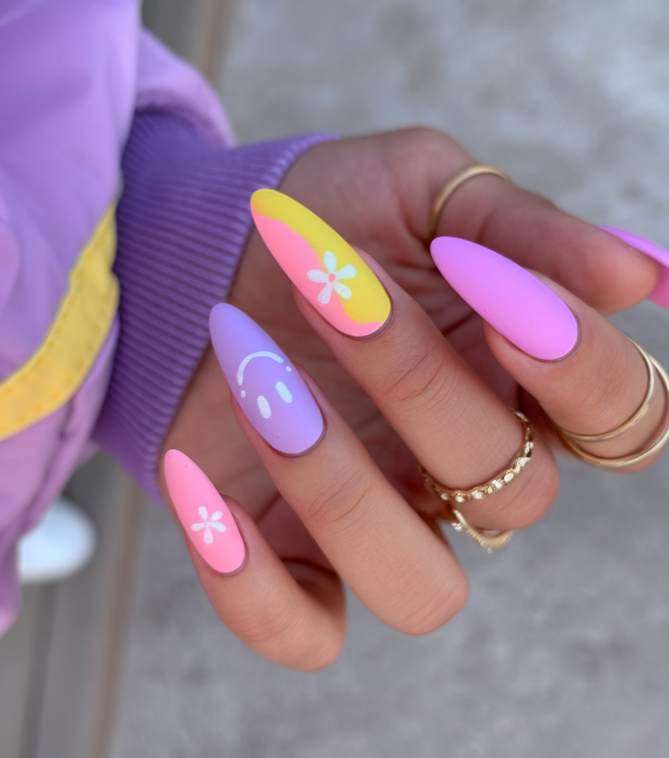 A dreamy spring almond manicure with a purple, pink, and yellow gradient in a soft matte finish. Minimalist white floral and smiley face details add a touch of whimsy, making this a cheerful 2025 almond nail design. The gel application ensures a smooth and seamless color blend, making it a trendy yet subtle look for the season.