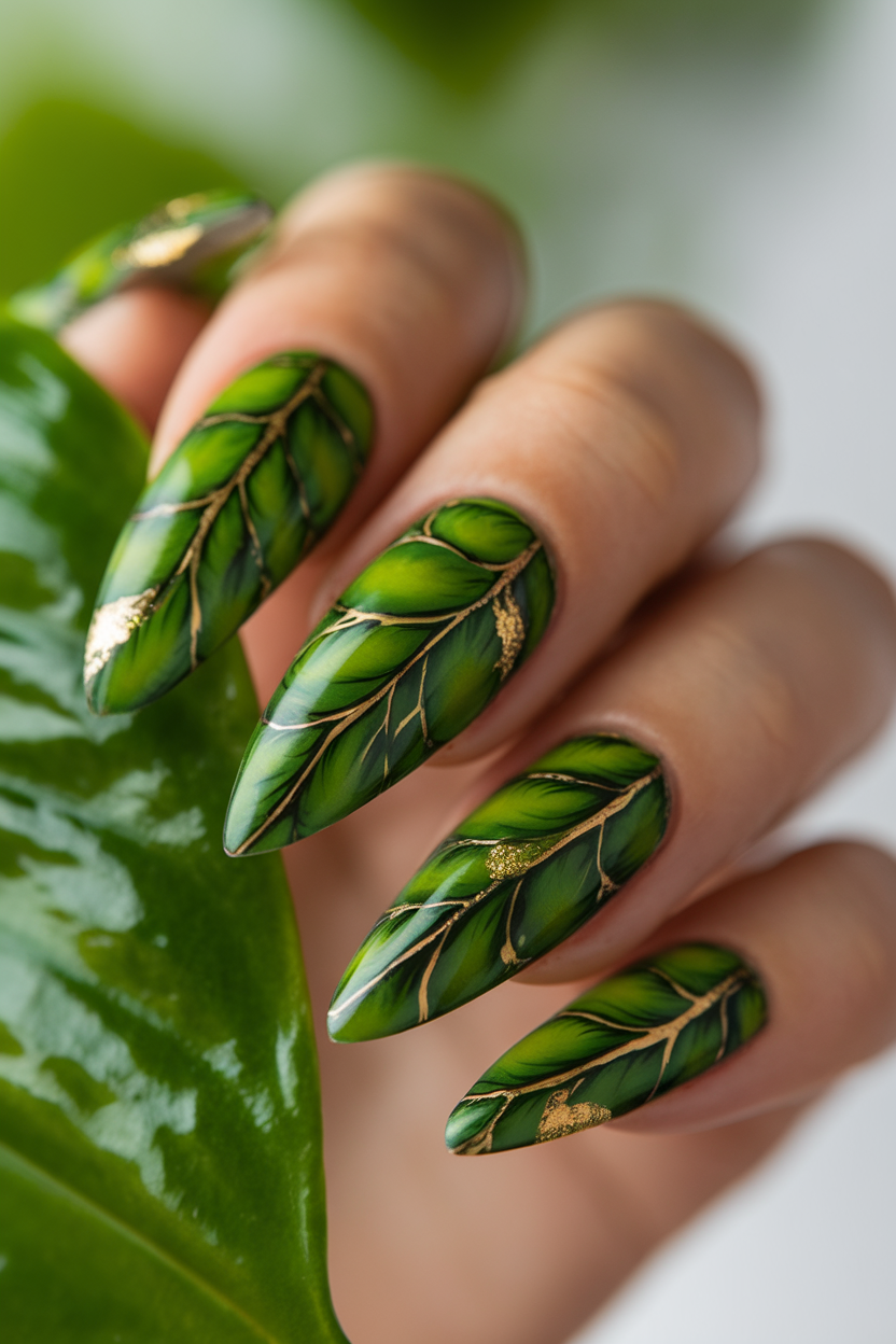 A stunning spring almond manicure featuring intricate simple green leaf designs with fine gold detailing. The gel polish gives a glossy, realistic effect, making the nails look like freshly painted foliage. This 2025 almond design is perfect for those who love nature-inspired, artistic nail art with a luxurious touch.