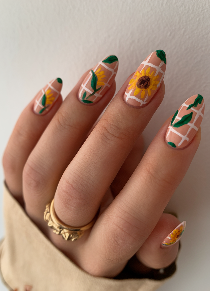A playful spring almond design combining spring yellow sunflower accents with a soft nude base and a white grid pattern. The gel polish ensures a smooth finish, while the hand-painted floral details add an artistic touch. This 2025 almond style is perfect for a fresh, nature-inspired spring short manicure.