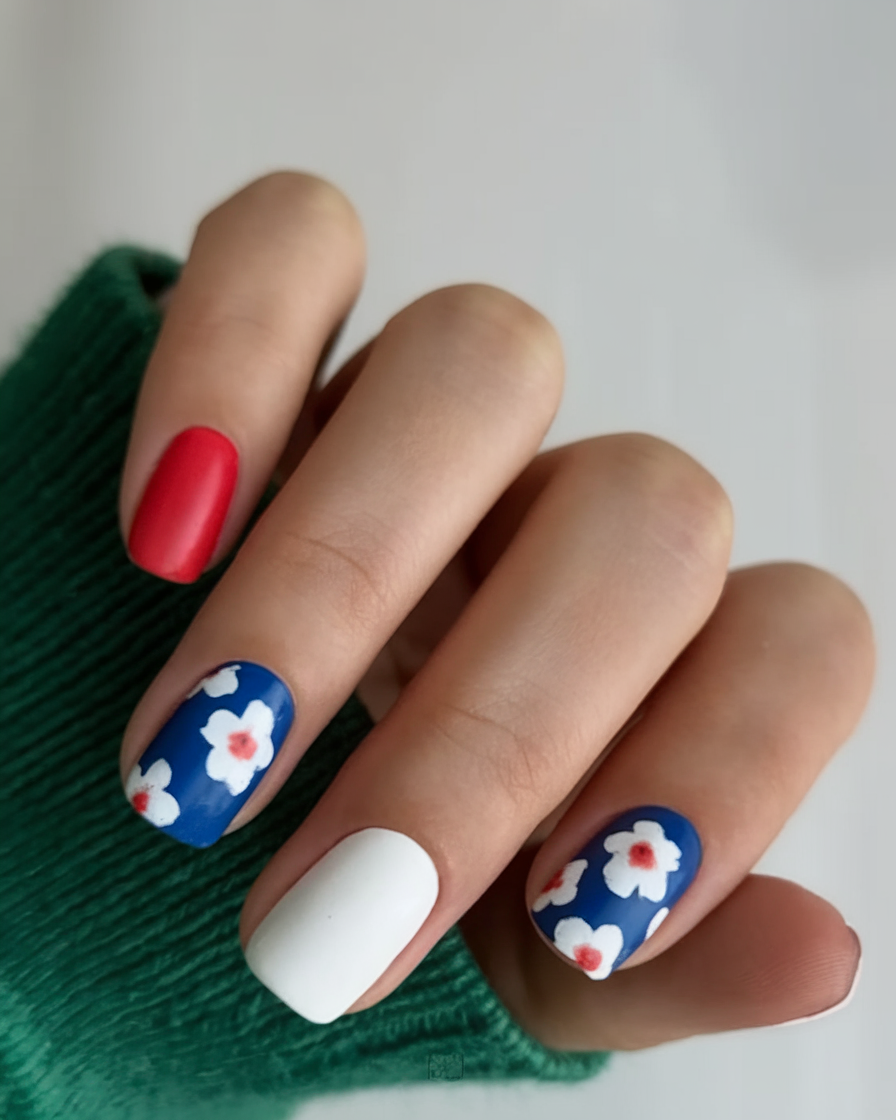A classic short square manicure featuring spring blue, white, and spring red with delicate floral accents. The gel finish enhances the contrast between the deep blue and the crisp white, while small red floral details add a subtle touch of color. This acrylic simple design is perfect for those who love a fresh and polished springtime manicure.