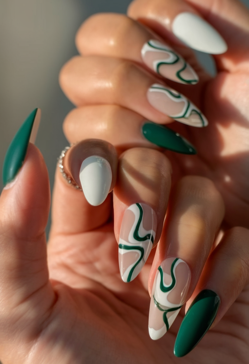 This spring almond manicure combines simple green and white tones with a modern abstract swirl design. The gel polish creates a sleek and glossy look, with some nails left in a nude base for contrast. The 2025 almond shape enhances the elegance of this contemporary nail art, making it perfect for both everyday wear and special occasions.