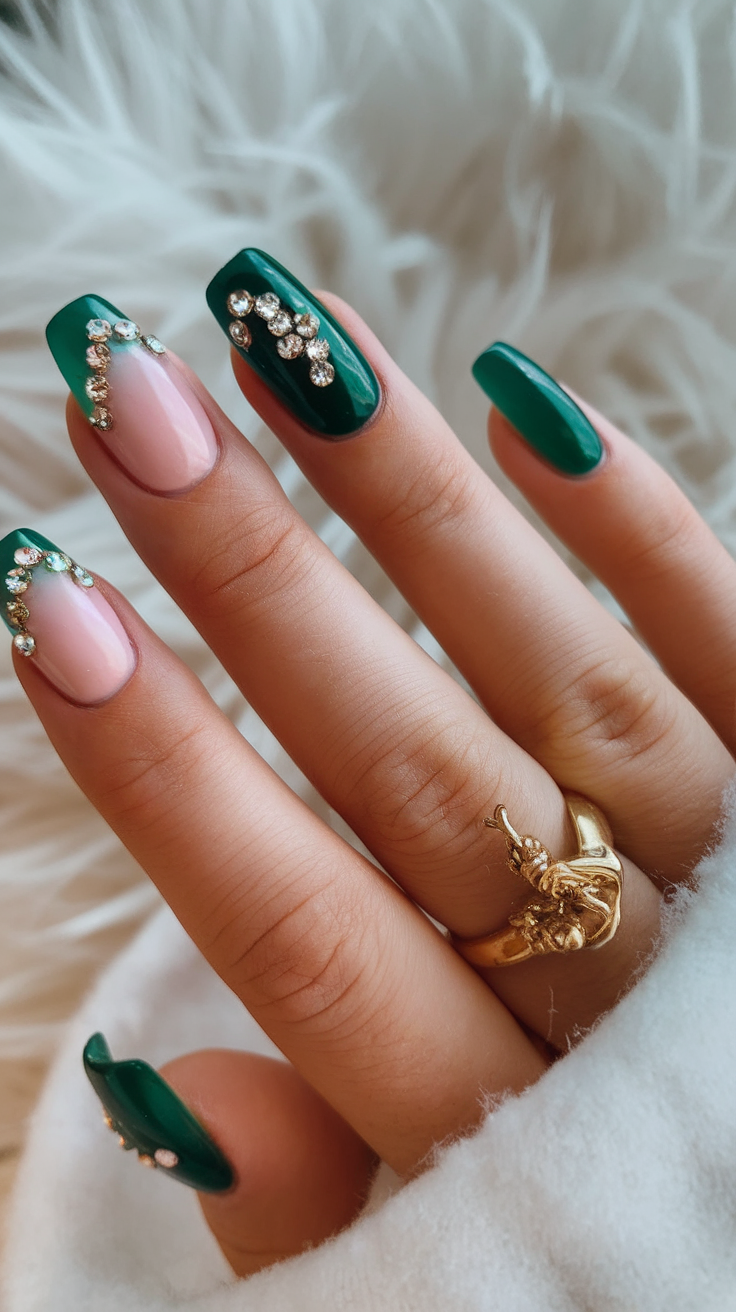 A bold spring green and spring pink combination with a touch of luxury. The short square nails alternate between a deep green gel polish and soft pink with sparkling rhinestone embellishments. This simple square yet glamorous look is ideal for those wanting a sophisticated acrylic simple manicure that shines under any light.