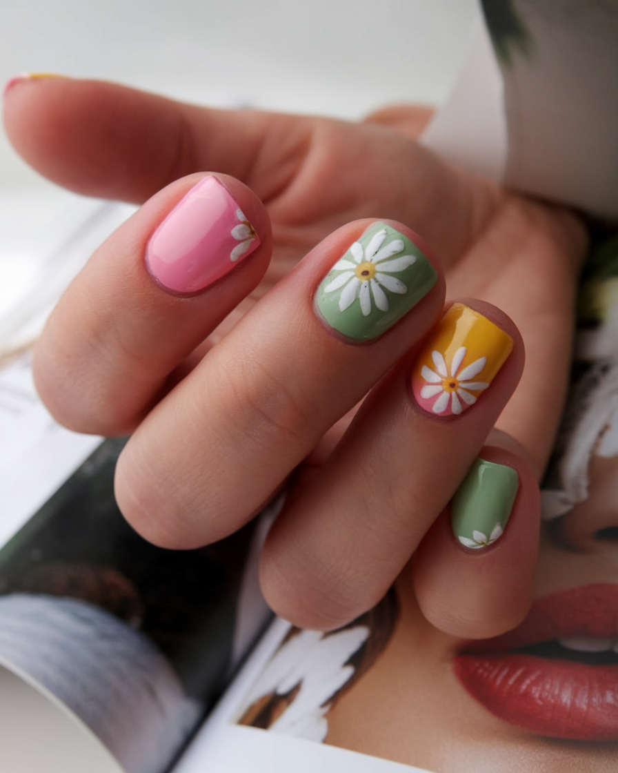 A charming mix of spring pink, spring green, and yellow tones make this short square manicure a perfect choice for the season. Each nail is painted with a soft gel finish, and delicate white daisies add a fresh floral touch. The acrylic simple design keeps it fun yet subtle, making it a great option for a spring short manicure with a playful twist.