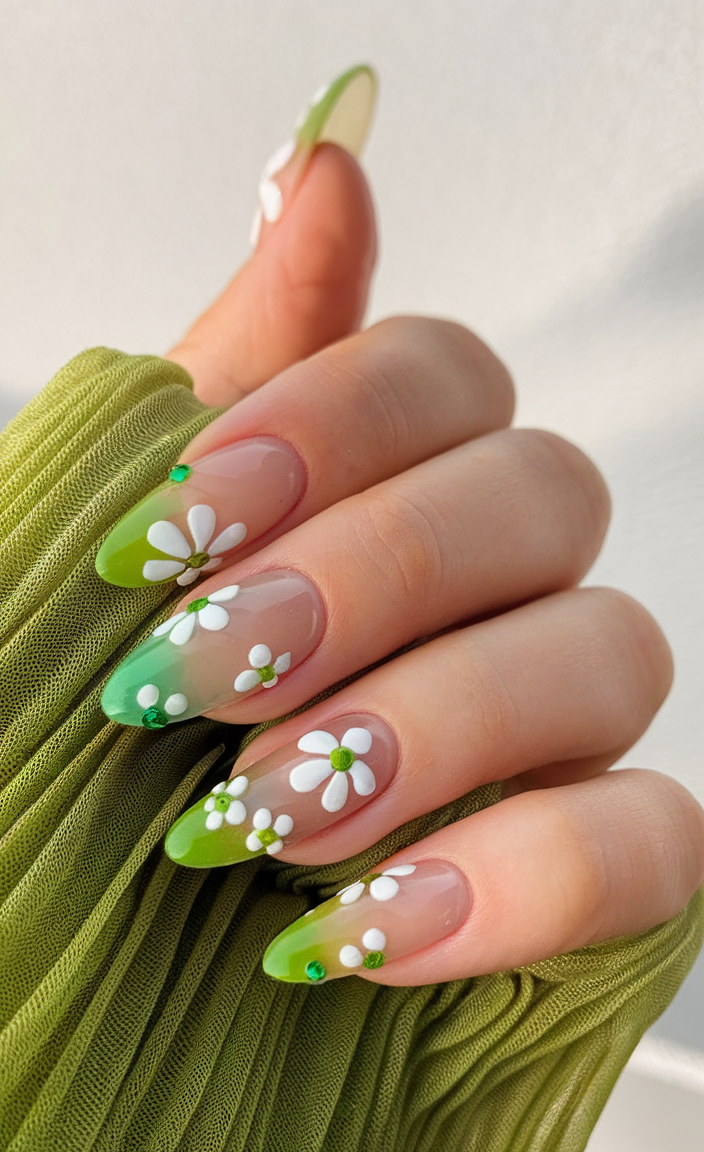 This spring almond manicure features simple green French tips with hand-painted white daisies for a fresh, botanical look. The 2025 almond shape elongates the nails, while small green gem embellishments add a hint of sparkle. The soft gel base allows the floral elements to stand out, making this a great option for a light and airy Easter or spring green nail design.