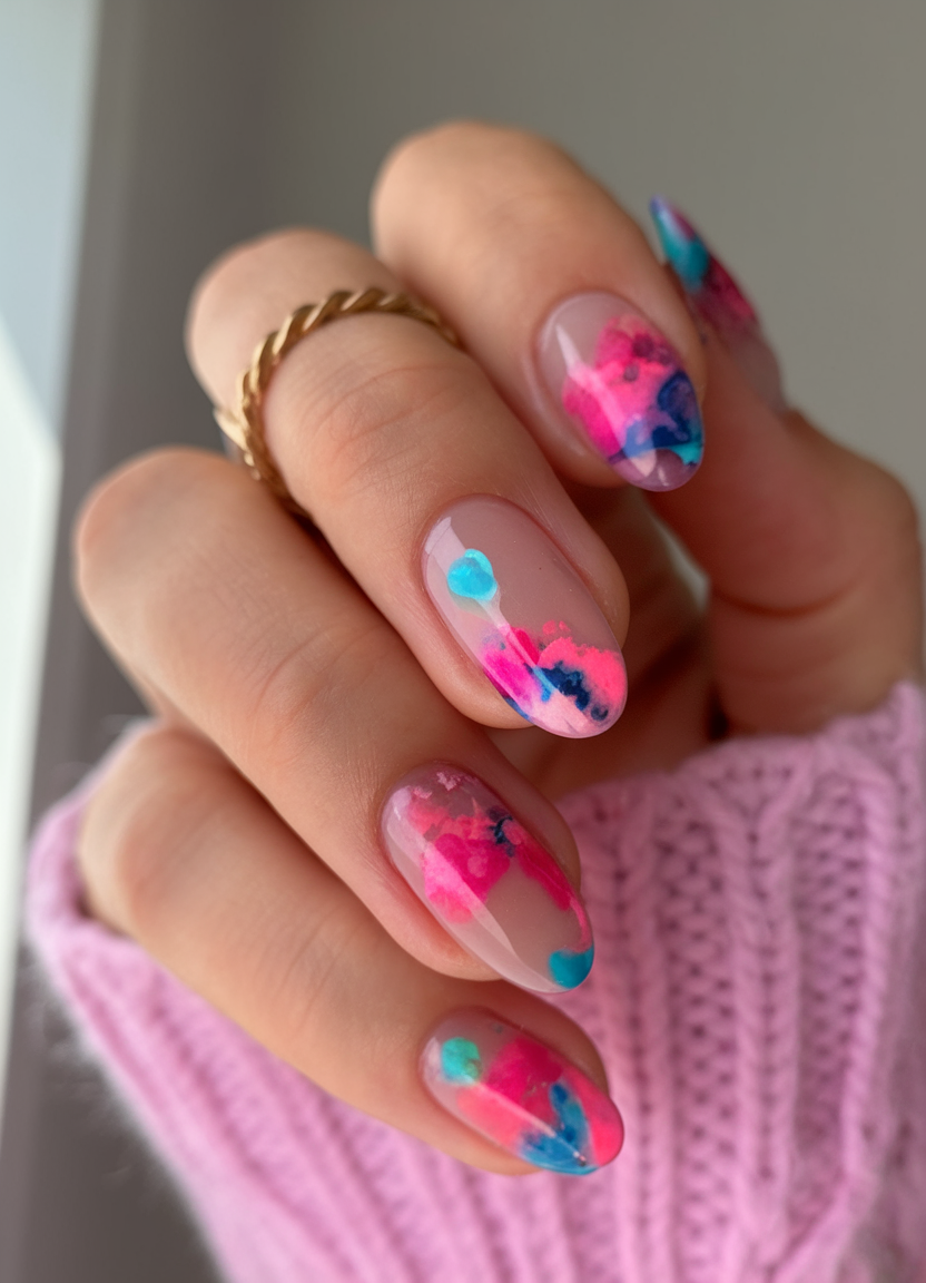 A dreamy mix of spring pink, blue, and purple hues create a watercolor-inspired design on these short square nails. The semi-transparent gel base gives a soft, cloud-like effect, while pops of vibrant color add an artistic touch. This acrylic simple manicure is a perfect choice for those who love abstract nail art while keeping things simple short and fresh for 2025.