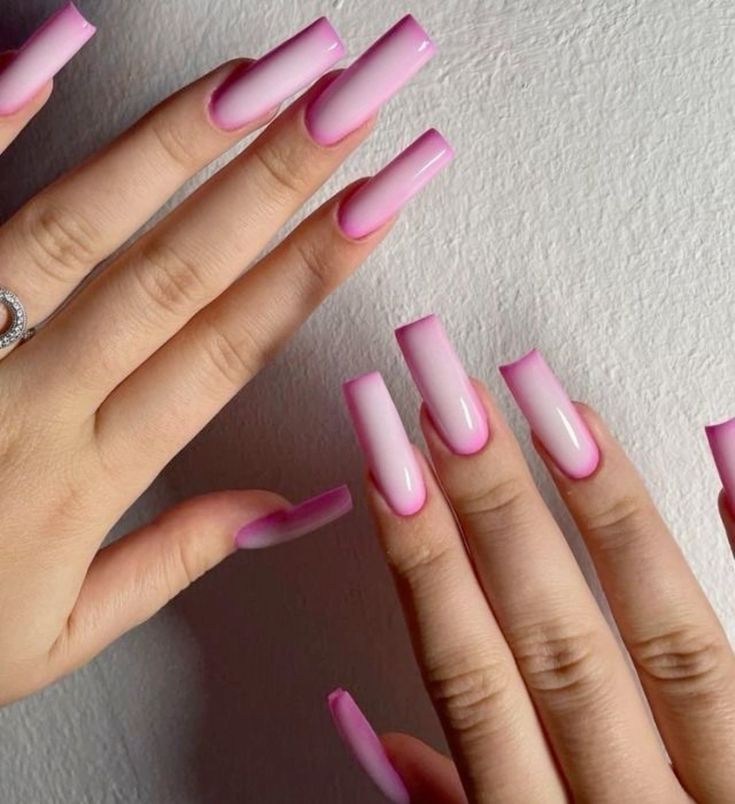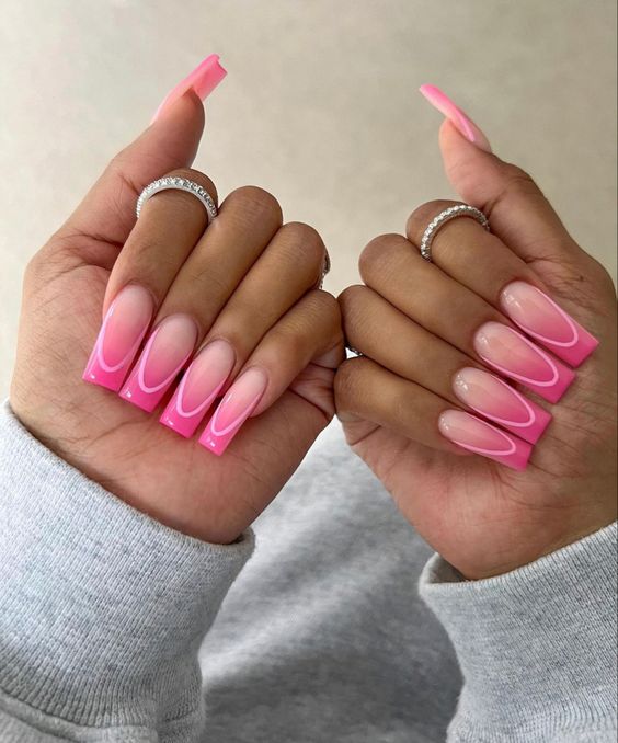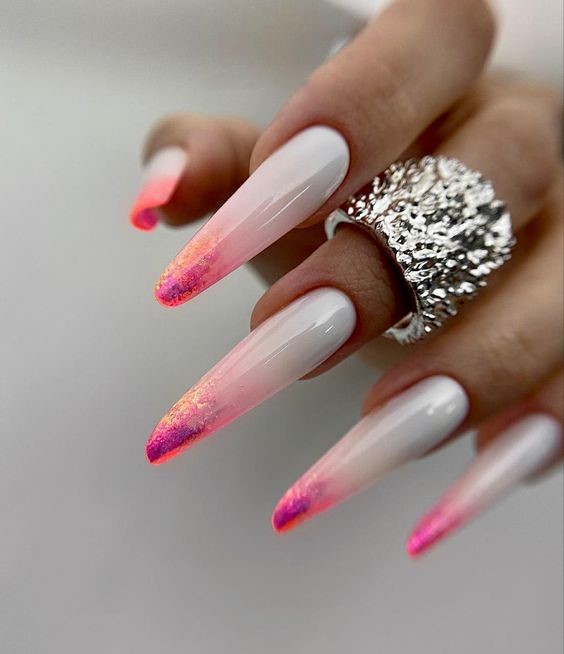 The subtlety of the gradient in these nails whispers the essence of summer’s sunset skies. A masterful blend of neon pink at the tips fades into a serene white and translucent base, creating an aesthetic reminiscent of cotton candy clouds. This design is not just a nail choice; it’s wearable art that speaks to those who prefer classy yet fun expressions of their style.