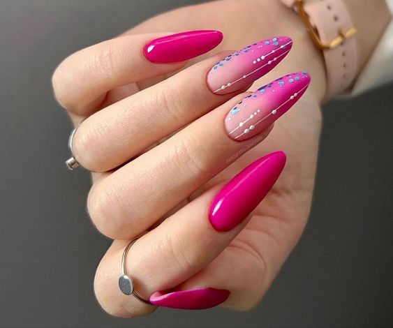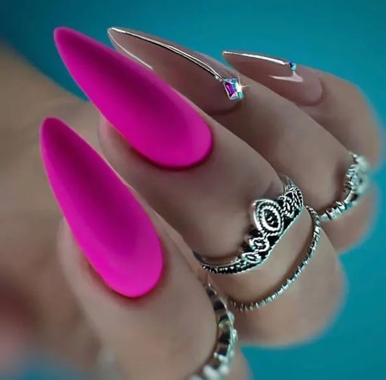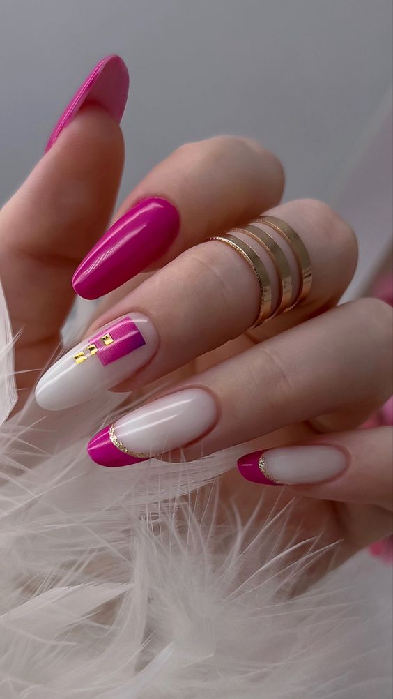 Bold pink meets geometric precision in this chic and classy design. The sharp lines and bright hues stand out against the milky pastel background, creating a look that’s both aesthetic and architecturally inspiring. These nails are for the woman who appreciates art in every detail and isn’t afraid to let her hands do the talking.