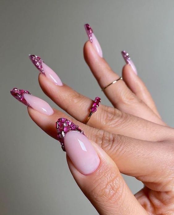 For those who love a little sparkle in their life, these nails are a dream come true. The pink transitions into a shower of golden glitter, reminiscent of a starlit summer night. This design combines classy elegance with a hint of fun, making it perfect for both day and evening wear.
