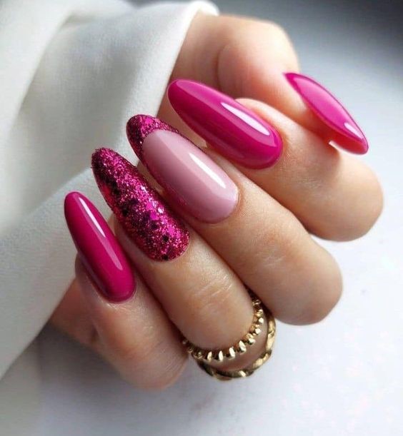 Contrast is key in this bold combination of glossy and matte textures. A single chrome-glittered nail stands out against the soft pastel and dark magenta, creating an ensemble that’s both classy and fun. It’s a versatile look that can transition from daywear to evening glamour with ease.