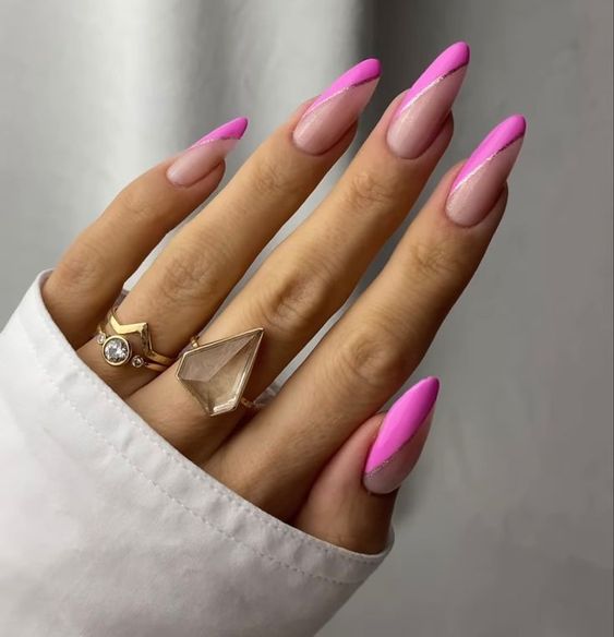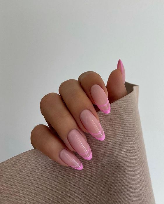 In a modern twist to the classic French manicure, these nails boast a neon pink tip that fades into a milky pale natural base. It’s a bright, simple yet classy look that radiates a contemporary vibe, fitting for the woman who appreciates a touch of tradition with a bold, fun twist.