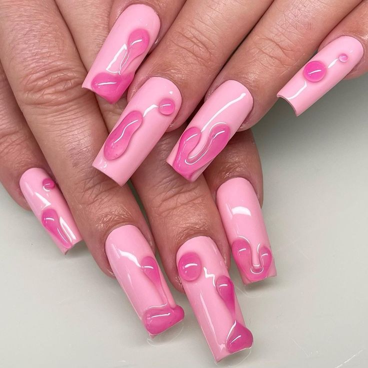 Imagine the gentle flow of a summer breeze captured on your fingertips – that’s the vision evoked by these pastel pink nails adorned with white and bright pink swirls. The 3D-like gel adds a tactile dimension, making each nail a cute and simple yet classy sculpture. These nails are perfect for a natural, understated look that still plays with creative designs.