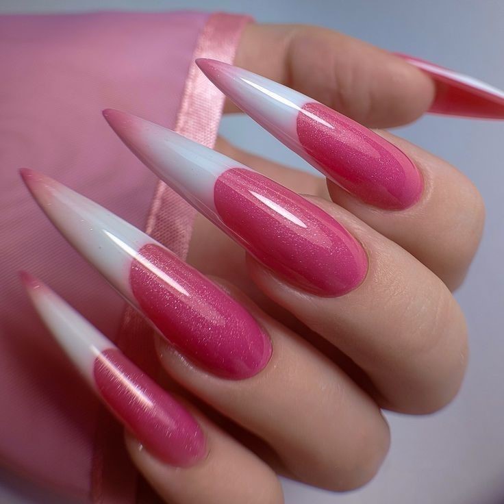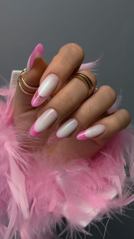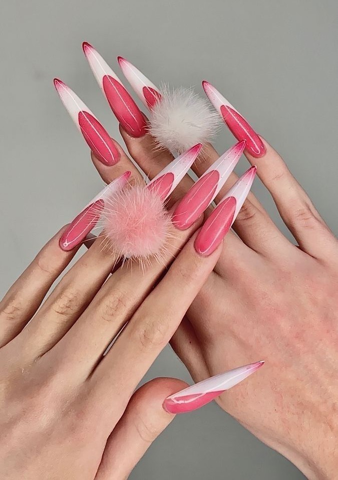 Sleek, sharp, and undeniably classy, these nails make a statement with their dark pink tips and geometric precision. The white and natural base highlights the neon pink accents, creating a look that’s both Barbie-esque and sophisticated. Perfect for the fashion-forward woman ready to conquer the boardroom or dazzle at a cocktail event.