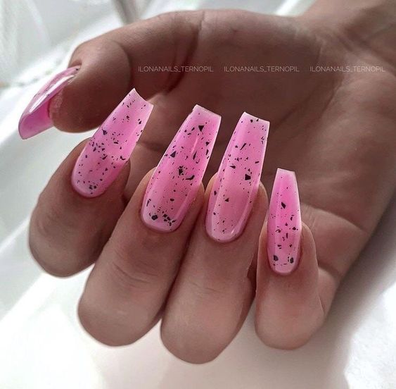 The pastel pink base speckled with black creates an unexpectedly aesthetic and classy design. This simple yet artistic look is for those who appreciate a modern twist to the classic pink, suitable for a chic gallery opening or a trendy cafe meetup.