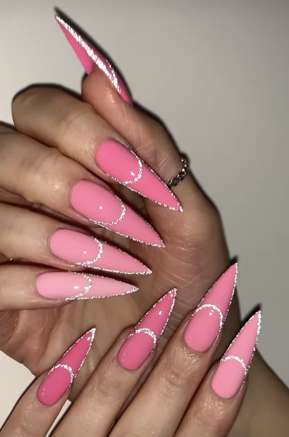 The French tip is reimagined with a daring pink that transitions into a soft pastel. The crisp white and silver lines redefine classy, bringing a modern twist to the iconic style. This look is simple, yet the execution is anything but – it’s a testament to precision and the beauty of contrast.