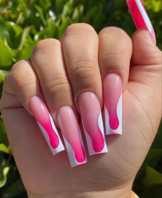 These nails seem to capture the essence of melting ice creams on a hot summer day. The pink seamlessly drips over a white base, creating an aesthetic that’s both simple and mesmerizing. This design is a cute nod to the fun of summer, ideal for a casual hangout or a spontaneous road trip.