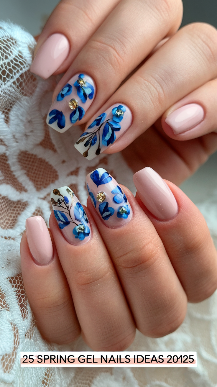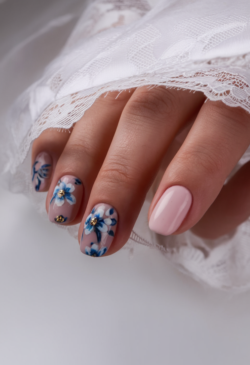 A delicate pastel pink base sets the stage for an artistic floral arrangement in deep blue hues. The hand-painted flowers, featuring soft watercolor effects, add a dreamy touch, while tiny gold embellishments at the flower centers provide a subtle luxury. The glossy top coat enhances the depth of the design, making the floral details stand out against the soft pink.