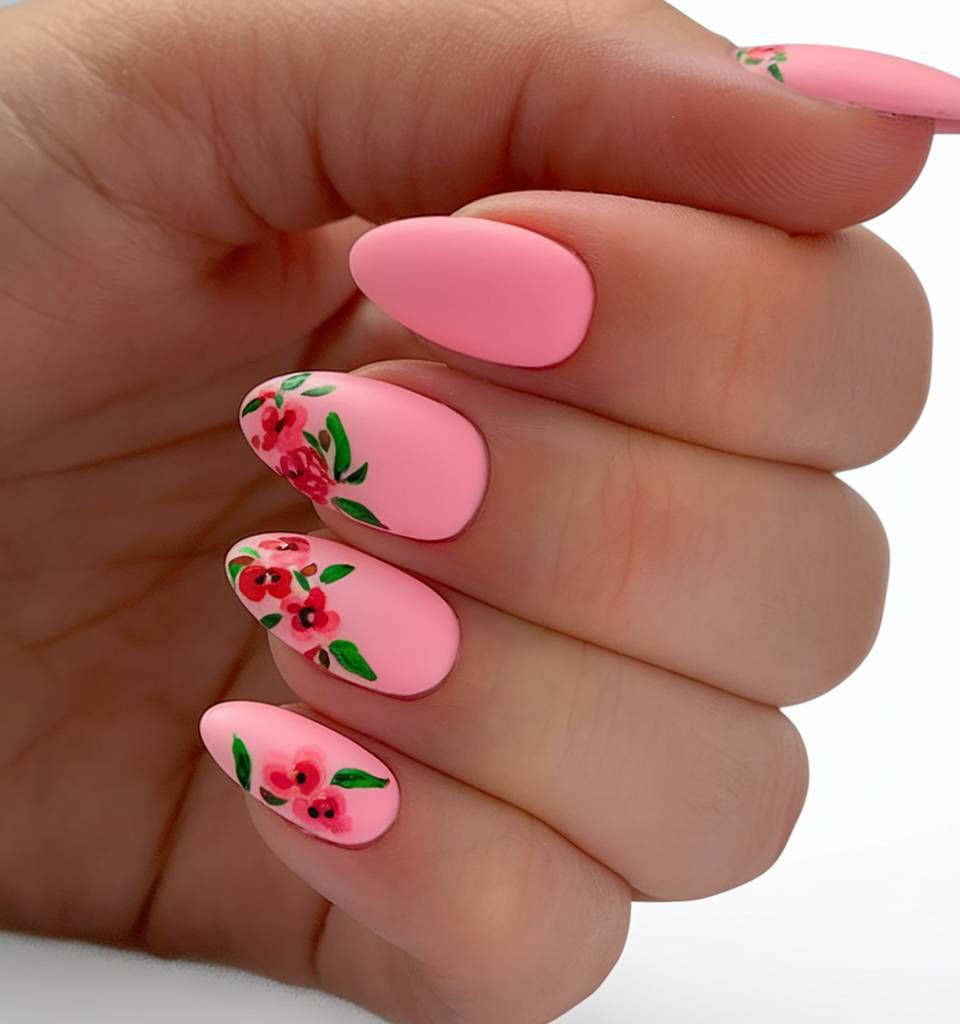 This 2025 almond nail design features a solid color pink base with hand-painted floral accents, perfect for a romantic spring look. The delicate red flowers and green leaves add a boho touch, making it an ideal set for nature lovers. The acrylic structure keeps the nails durable while maintaining a soft, feminine charm. The matte finish enhances the pastel appeal, making it a timeless choice for the season.