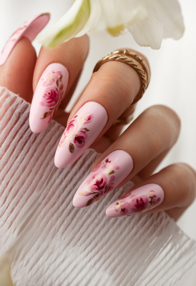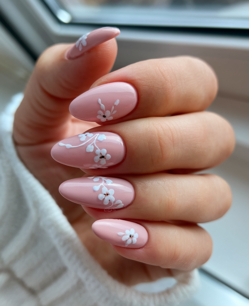 #22 Soft Pink Almond Nails with Delicate Floral Accents